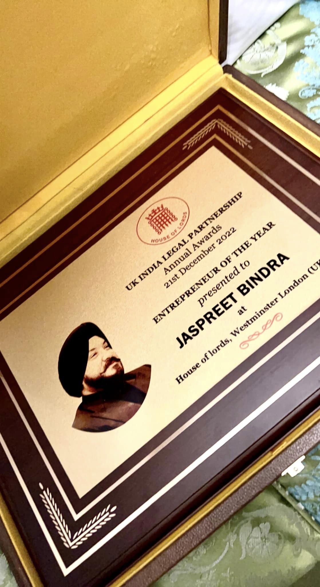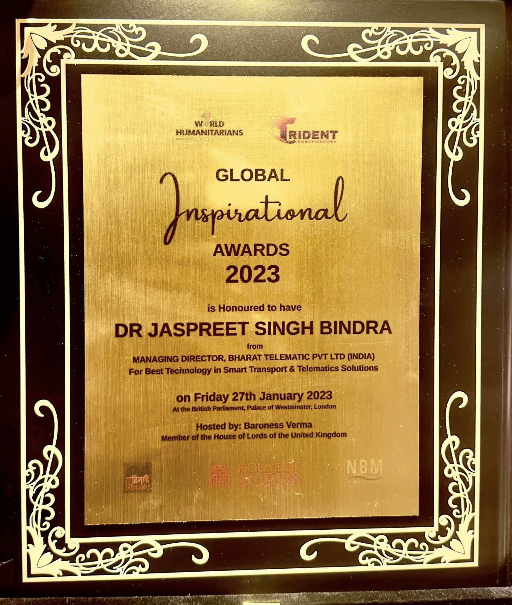 Dr.Jaspreet Singh Bindra Managing Director of Bharat Telematics Pvt Ltd(INDIA) Awarded For Best Technology in Smart Transport & Telematics Solutions in House Of Lords, British Parliament on 27th January 2023, organised by World Humanitarian Foundation and Trident Communications.