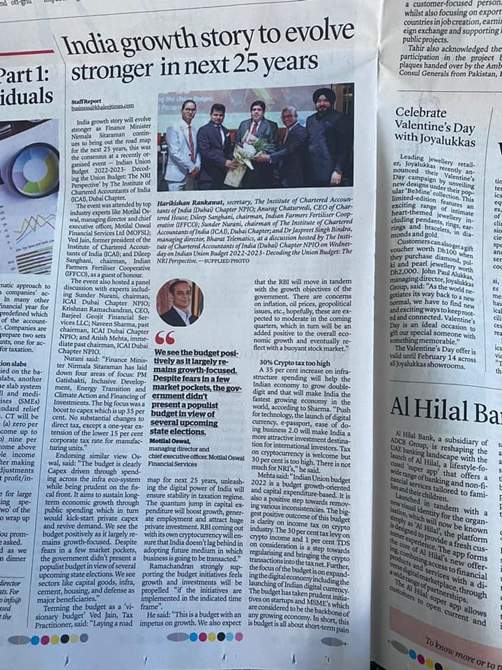 It was great to have experts from the industry like Motilal Oswal, MD and CEO, Motilal Oswal Financial Services Ltd (MOFSL); Ved Jain, ex-president of ICAI; Dileep Sanghani, Chairman, Indian Farmers Fertiliser Cooperative (IFFCO); Harikishan Rankawat, secretary of The Institute of Chartered Accountants of India (Dubai) Chapter NPIO; Anurag Chaturvedi, CEO of Chartered House; Sunder Nurani, Chairman of The Institute of Chartered Accountants of India (ICAI), Dubai Chapter; and Dr Jaspreet Singh Bindra, Managing Director, Bharat Telematics, at a discussion hosted by The Institute of Chartered Accountants of India (Dubai) Chapter NPIO on Wednesday on Indian Union Budget 2022-2023- Decoding the Union Budget: The NRI Perspective.