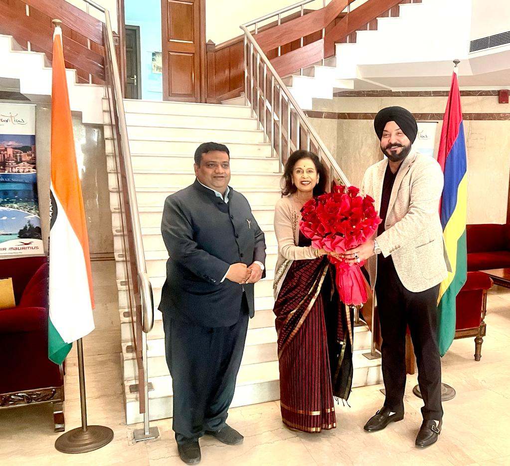 Meeting with Mauritius High Commissioner Mrs Santi Bai Hanoomanjee, GCSK in Mauritius High Commission to India 🇮🇳 🇲🇺 ,also, present in the meeting were Mr Umesh Kumar Sookmanee First Secretary in Mauritius High Commission. Dr Gaurav Gupta Founder President of Global Trade & Technology Council of India (GTTCI)